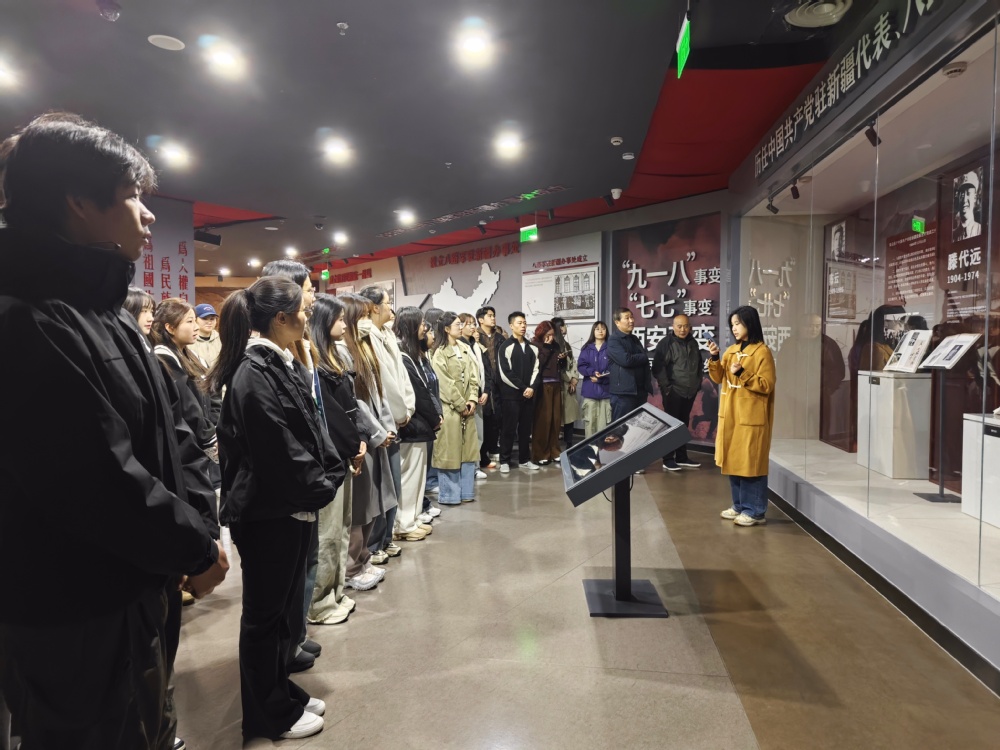 在八路军驻新疆办事处纪念馆内,王畅、韩晗、吴英鹤三位同学进行了生动解说,同时大家也仔细观看了展出的历史照片、文献资料和珍贵文物,深入了解了八路军驻新疆办事处为抗战胜利、民族解放事业所做出的卓越贡献。