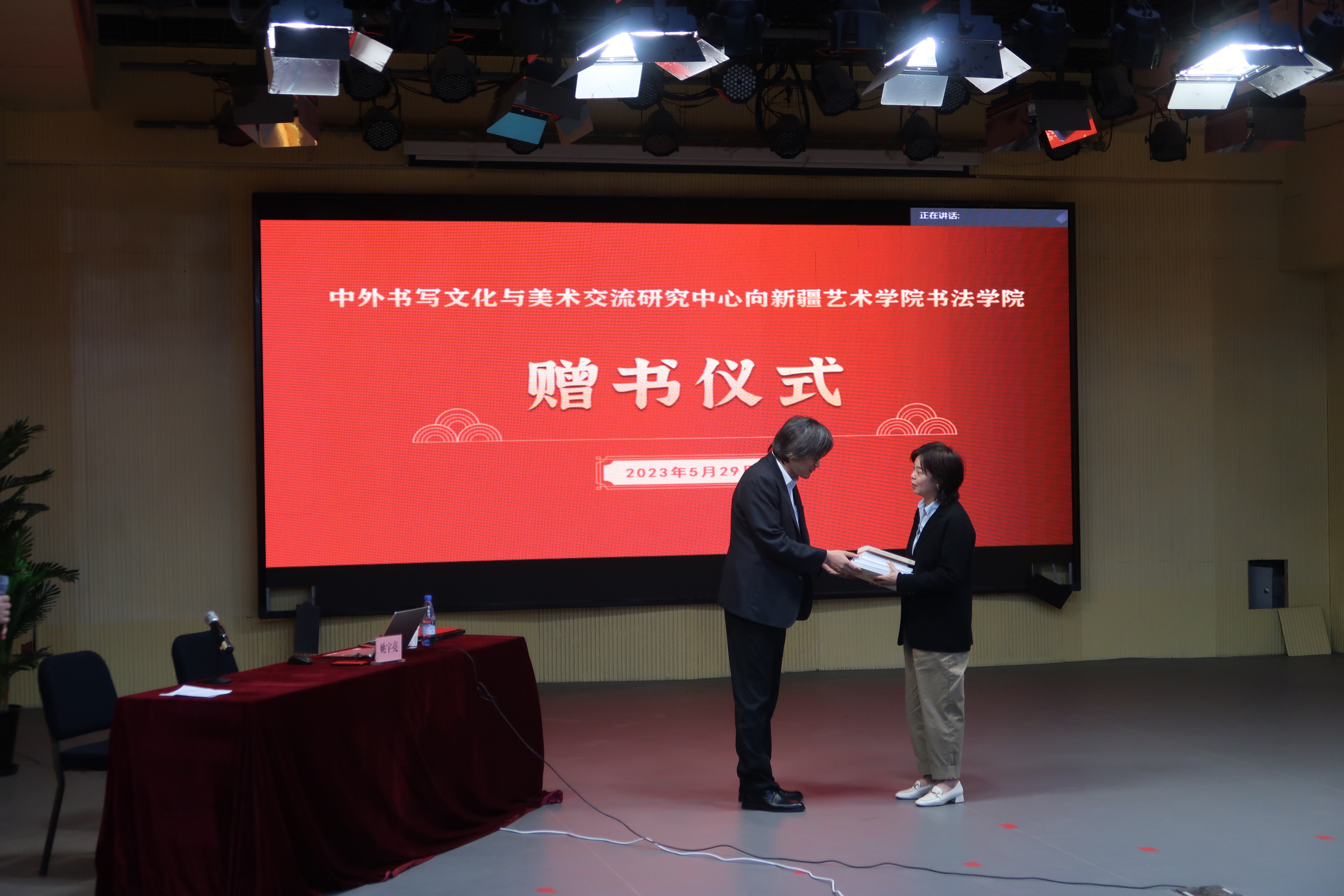 报告会后,举行了中外书写文化和美术交流研究中心向新疆艺术学院书法学院赠书仪式。