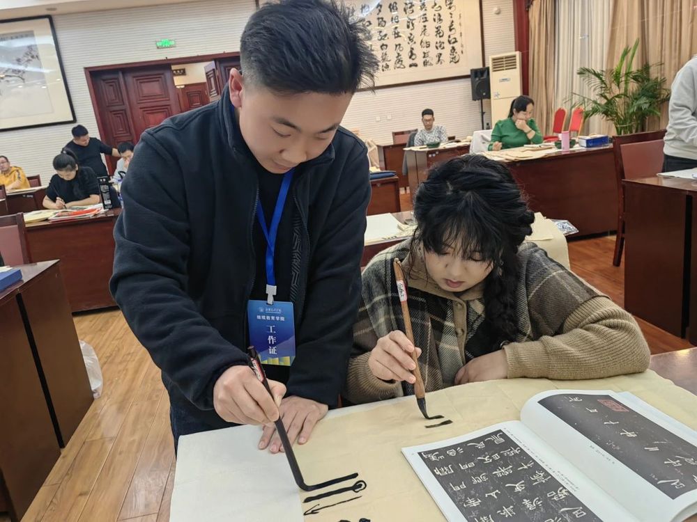 晚自习时间,学员们在任课老师和助教的指导下满怀热情投入书法学习中。