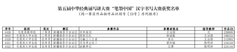 近日,教育部语用司发布《关于公布第五届中华经典诵写讲大赛获奖名单的通知》(教语用司函〔2024〕1号),公布了本届大赛获奖作品名单,同时于中华经典诵写讲大赛官方网站公布。新疆艺术学院书法学院师生在“笔墨中国”汉字书写大赛与“印记中国”师生篆刻大赛中共斩获8项国家级奖项。其中,教师王治国获汉字书写大赛毛笔类教师组二等奖;柳涵懿获毛笔类大学生组二等奖,王博、梁和瑄、李杰获优秀奖;张丁阳、景一冲获篆刻大赛手工篆刻大学生组二等奖,闫皓宇获三等奖。