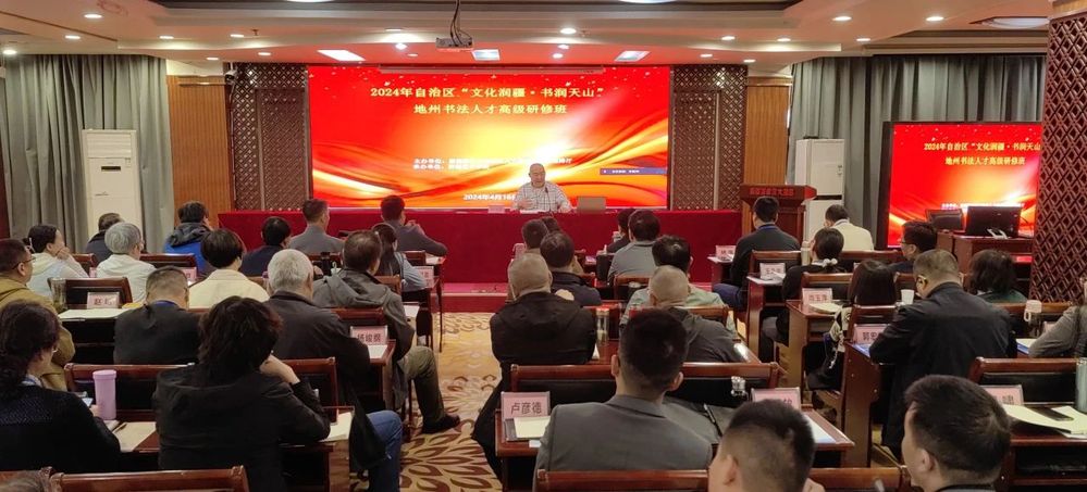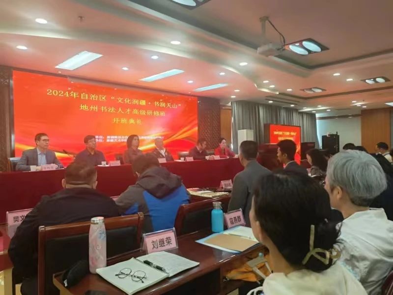 4月16日—20日,2024年自治区“文化润疆·书润天山”地州书法人才高级研修班在乌鲁木齐市圆满举办。新疆艺术学院副院长木亚赛尔·托乎提、自治区文联副主席、新疆书法家协会主席张鸿林、新疆书协秘书长杨晓刚以及相关部门负责人和专家教授参加开班仪式。