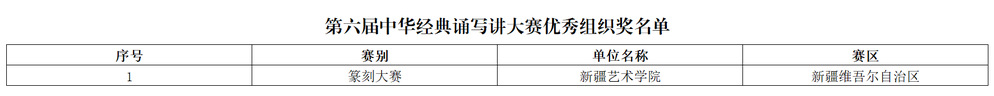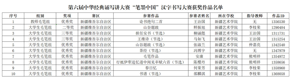 新疆艺术学院书法学院师生在大赛中共斩获13项奖项。其中鲜振旭获毛笔类大学生组二等奖,柳涵懿、马如飞获三等奖,张淑兰、冯博宇、安康、陈樱丹、何荣芳、邵麟淇获优秀奖;景一冲获篆刻大赛大学生组一等奖,冯博宇获优秀奖;院长李枝荣获优秀指导教师奖;教师王治国获汉字书写大赛毛笔类教师组优秀奖。新疆艺术学院获篆刻大赛优秀组织奖。