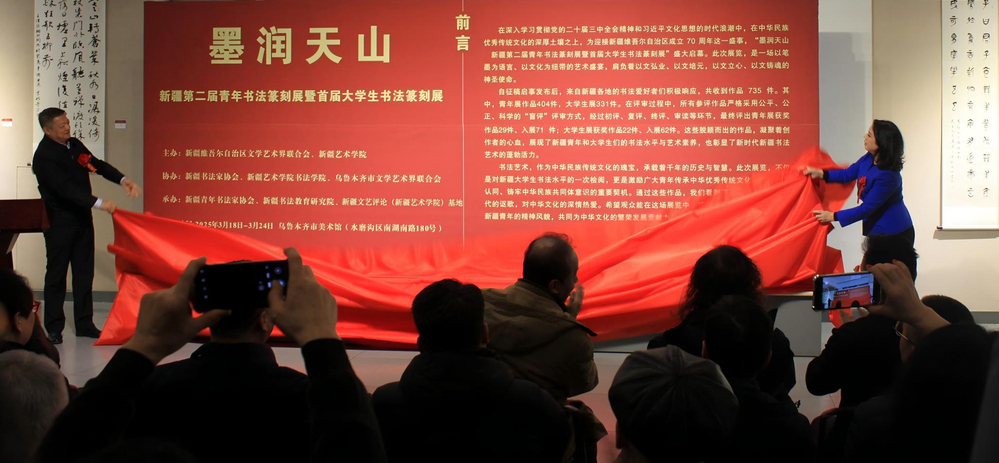 3月18日,墨润天山・新疆第二届青年书法篆刻展暨首届大学生书法篆刻展在乌鲁木齐市美术馆开幕。此次展览由新疆维吾尔自治区文学艺术界联合会、新疆艺术学院主办,新疆书法家协会、新疆艺术学院书法学院、乌鲁木齐市文学艺术届联合会协办,新疆青年书法家协会、新疆书法教育研究院、新疆文艺评论(新疆艺术学院)基地承办。