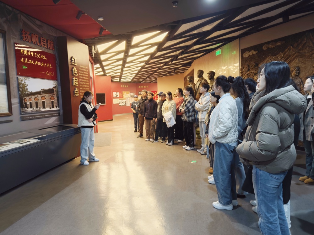 在八路军驻新疆办事处纪念馆内,王畅、韩晗、吴英鹤三位同学进行了的生动解说,同时大家也仔细观看了展出的历史照片、文献资料和珍贵文物,深入了解了八路军驻新疆办事处为抗战胜利、民族解放事业所做出的卓越贡献。
