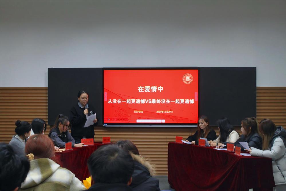 12月30日,书法学院辩论赛进入尾声,此次赛事共设三场,分别围绕就业、友情、爱情三大热门话题展开,吸引众多同学踊跃参与,为校园注入了蓬勃的思辨活力。