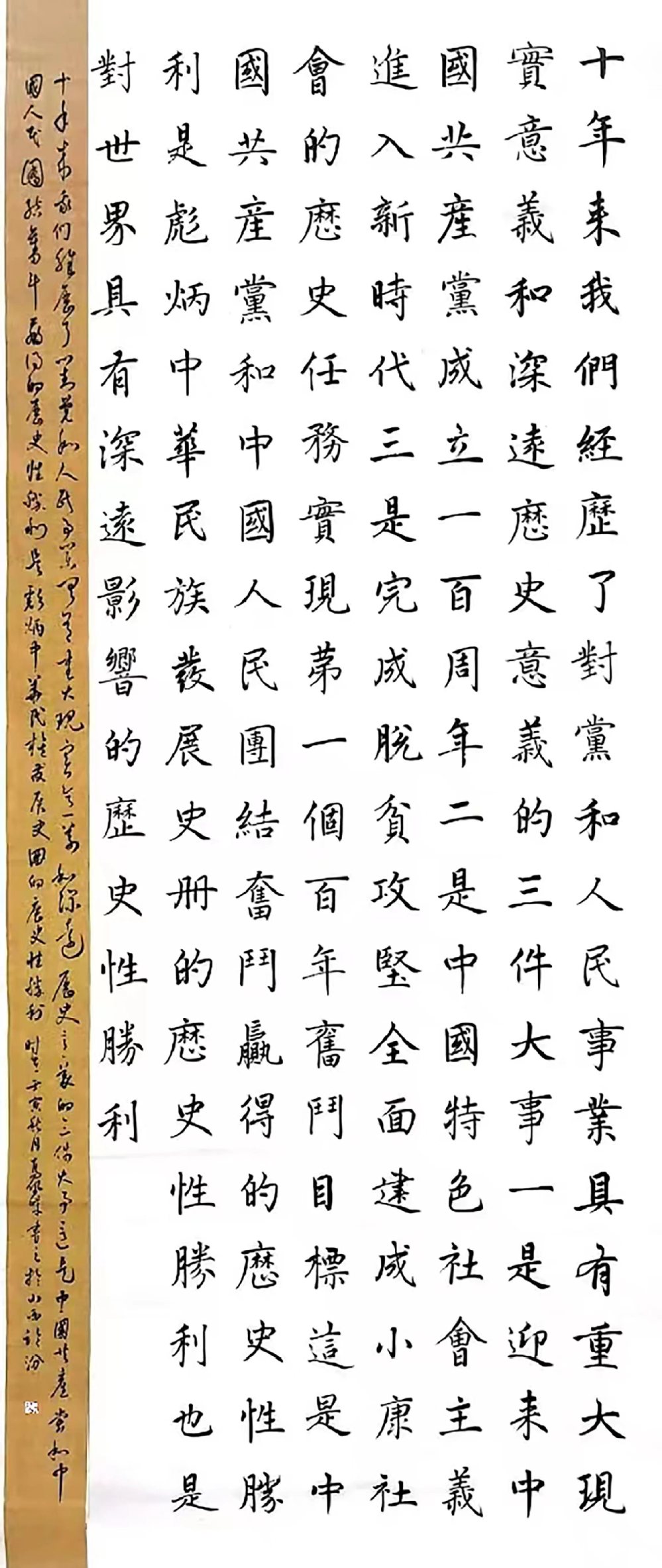 作品释文:十年来,我们经历了对党和人民事业具有重大现实意义和深远历史意义的三件大事:一是迎来中国共产党成立一百周年,二是中国特色社会主义进入新时代,三是完成脱贫攻坚、全面建成小康社会的历史任务,实现第一个百年奋斗目标。这是中国共产党和中国人民团结奋斗赢得的历史性胜利,是彪炳中华民族发展史册的历史性胜利,也是对世界具有深远影响的历史性胜利。