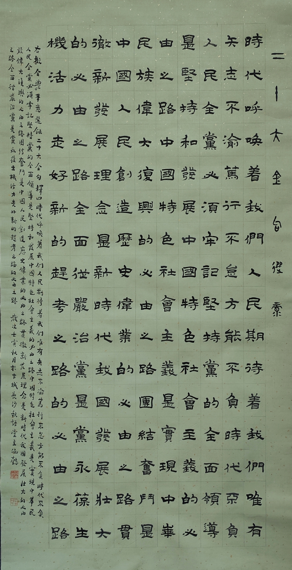 作品释文:时代呼唤着我们,人民期待着我们,唯有矢志不渝、笃行不怠,方能不负时代、不负人民。全党必须牢记,坚持党的全面领导是坚持和发展中国特色社会主义的必由之路,中国特色社会主义是实现中华民族伟大复兴的必由之路,团结奋斗是中国人民创造历史伟业的必由之路,贯彻新发展理念是新时代我国发展壮大的必由之路,全面从严治党是党永葆生机活力、走好新的赶考之路的必由之路。