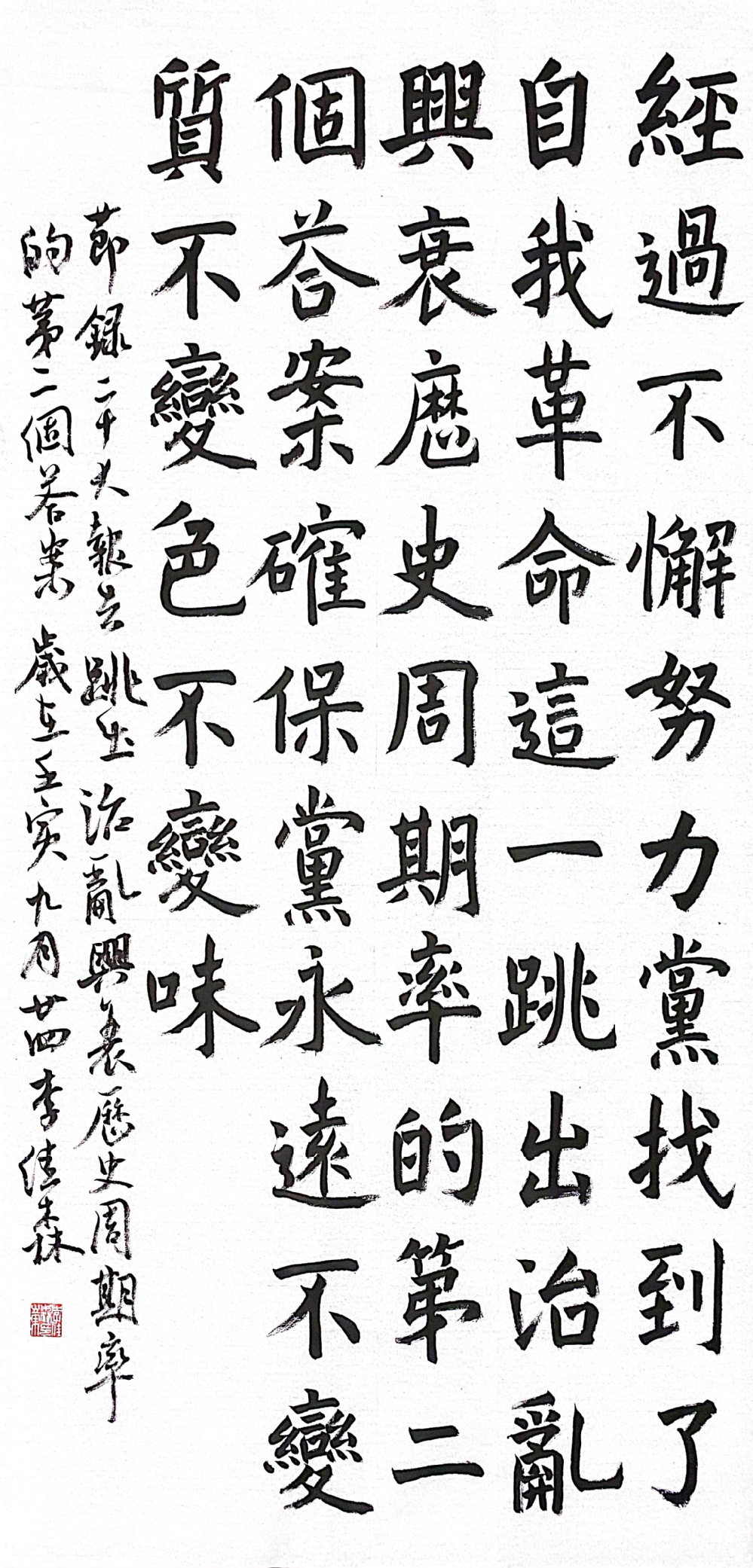 作品释文:经过不懈努力,党找到了自我革命这一跳出治乱兴衰历史周期率的第二个答案,确保党永远不变质、不变色、不变味。