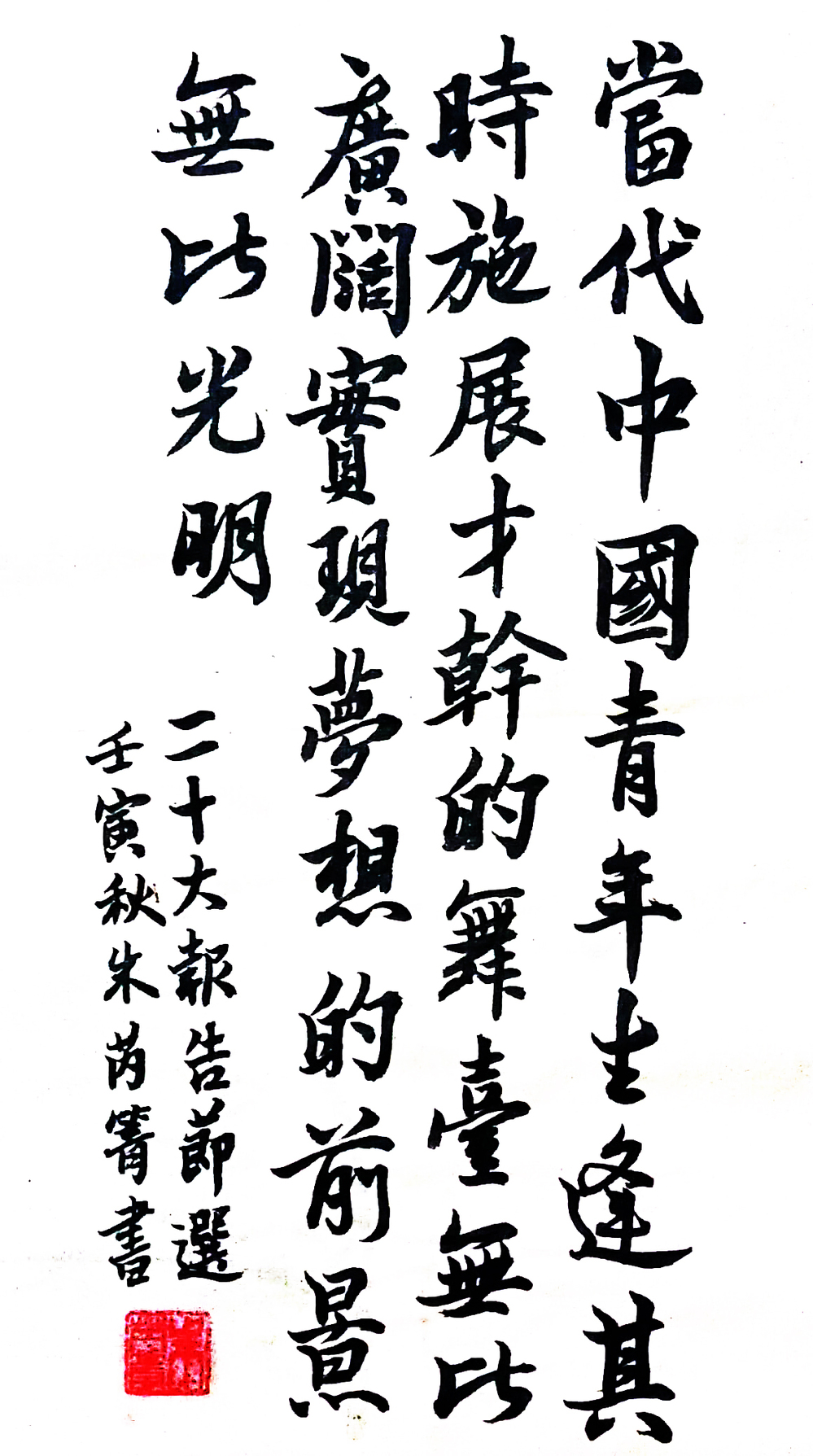 作品释文:当代中国青年生逢其时,施展才干的舞台无比广阔,实现梦想的前景无比光明。