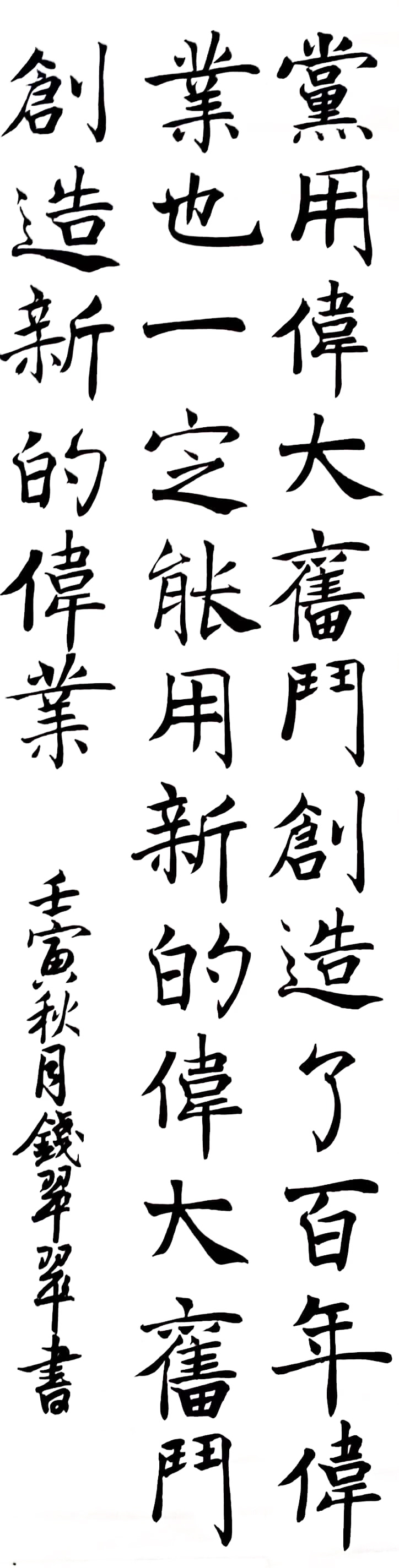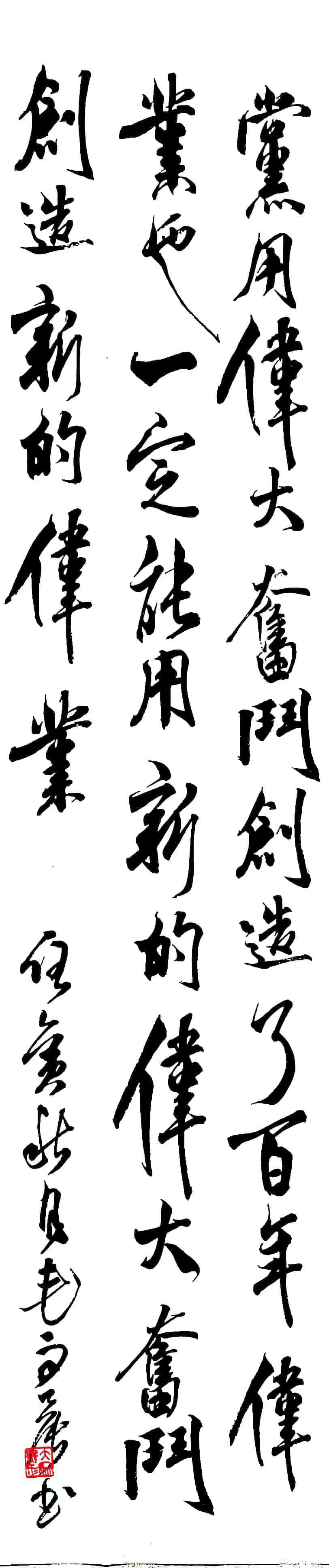 作品释文:党用伟大奋斗创造了百年伟业,也一定能用新的伟大奋斗创造新的伟业。