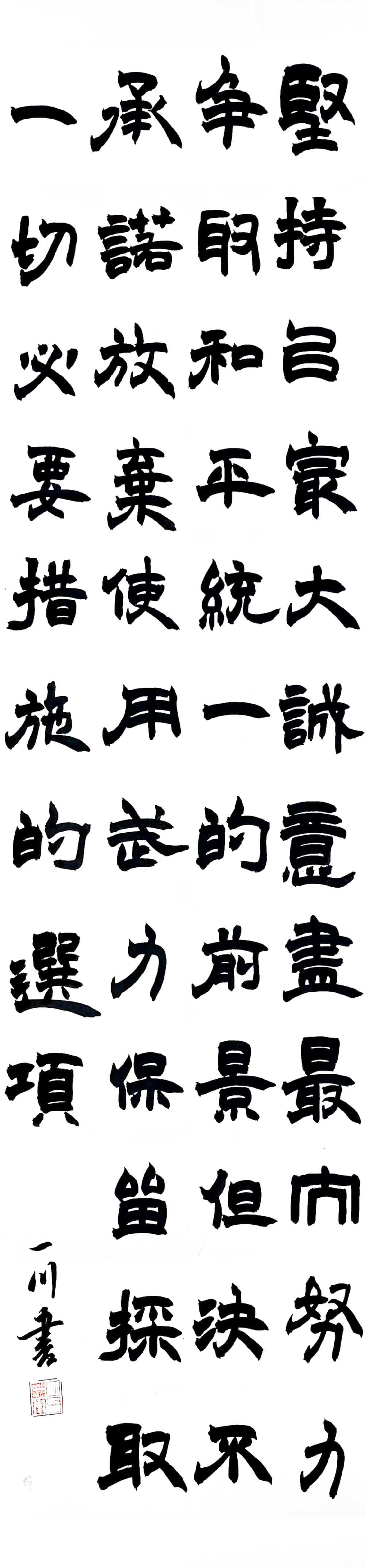 作品释文:坚持以最大诚意、尽最大努力争取和平统一的前景,但决不承诺放弃使用武力,保留采取一切必要措施的选项。