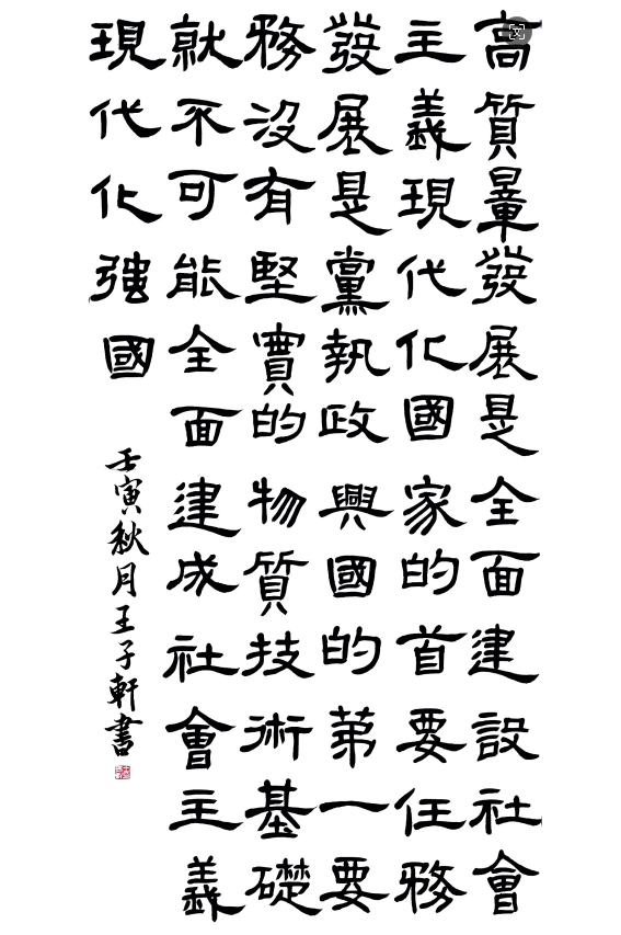 作品释文:高质量发展是全面建设社会主义现代化国家的首要任务。发展是党执政兴国的第一要务。没有坚实的物质技术基础,就不可能全面建成社会主义现代化强国。