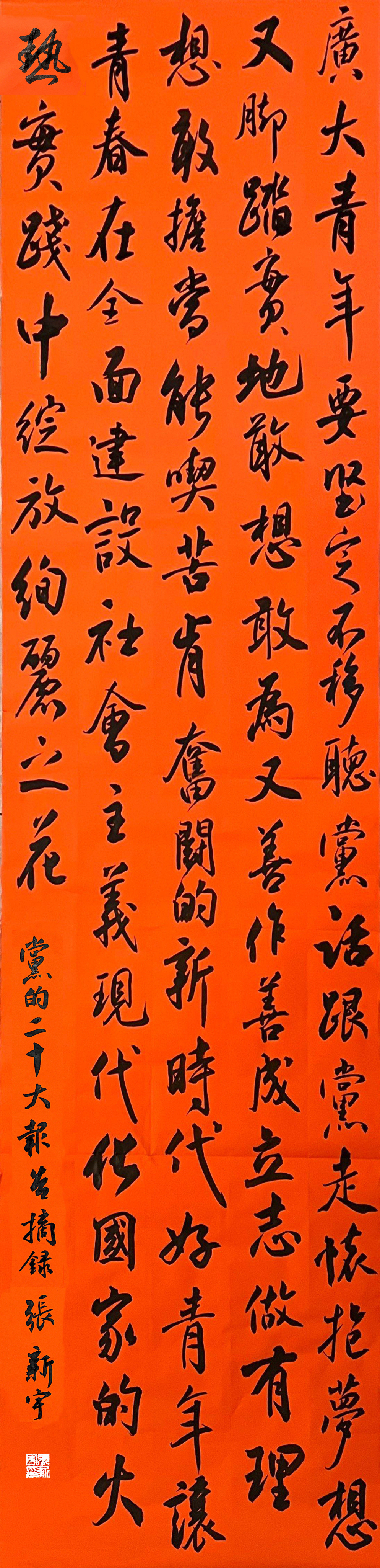 作品释文:广大青年要坚定不移听党话、跟党走,怀抱梦想又脚踏实地,敢想敢为又善作善成,立志做有理想、敢担当、能吃苦、肯奋斗的新时代好青年,让青春在全面建设社会主义现代化国家的火热实践中绽放绚丽之花。