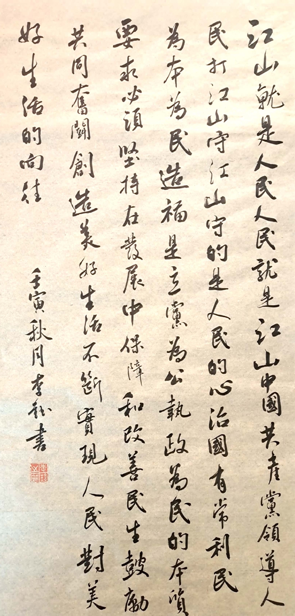 作品释文:江山就是人民,人民就是江山。中国共产党领导人民打江山、守江山,守的是人民的心。治国有常,利民为本。为民造福是立党为公、执政为民的本质要求。必须坚持在发展中保障和改善民生,鼓励共同奋斗创造美好生活,不断实现人民对美好生活的向往。