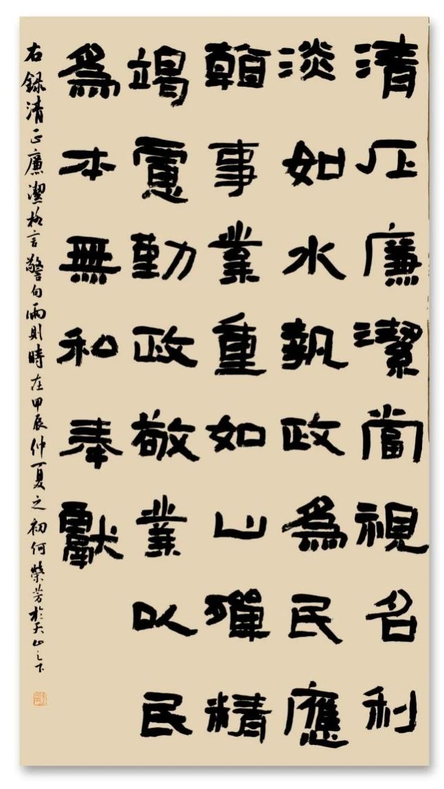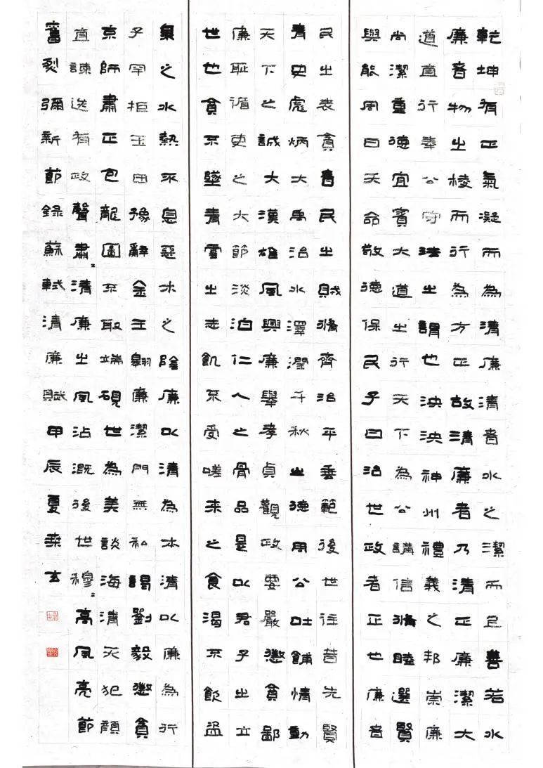 本组作品分别选取了《爱莲说》《拒礼诗》《咏煤炭》《清廉赋》《清正廉洁警句荟萃》《习近平总书记关于廉洁文化的论述》古今关于廉洁的诗词文章,采用隶书和楷书的风格,用中堂、条屏、简牍的形式,由四名硕士研究生完成,作品厚重古朴,端庄凝重,有较强的艺术感,具有正大气象,契合廉洁主题和无私奉献的精神,廉洁奉公,它体现一个人的思想素质、精神境界、道德操守,每一个人应当廉洁无私,身正心清。