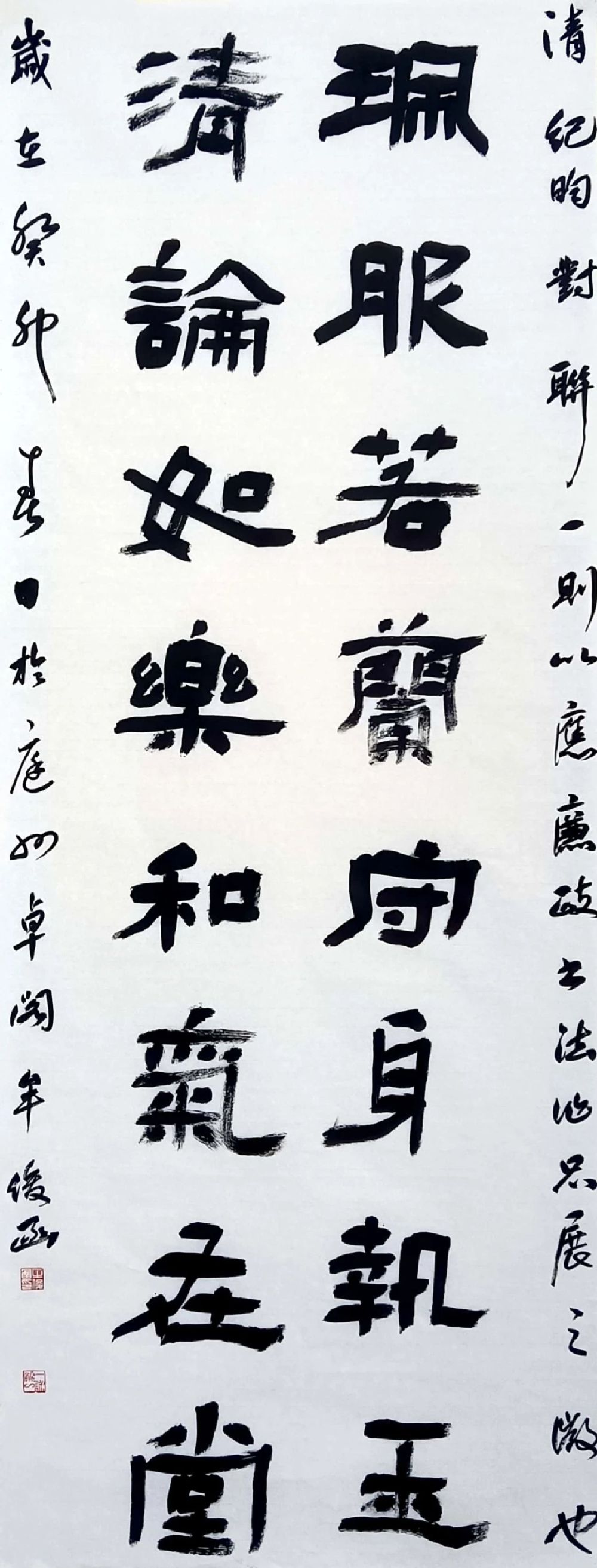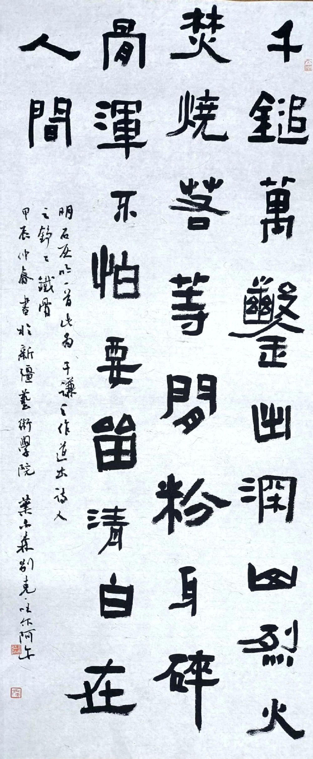 本组作品分别选取了《清正廉洁葆本色》《石灰吟》《佩服清论对联》《颜真卿守政帖》古今关于廉洁的诗词文章,采用隶书和楷书的风格,用中堂、条屏、对联、斗方的形式,由四名本科生完成,通过古今名人对廉洁论述的书写,体现了书法艺术与诗词文章的美妙结合。书法作品或刚劲有力、或古朴典雅,表现出一种坚强不屈、浩然正气、洁身自好的高尚品质,反映了人们对高尚品质和和谐美好事物的追求和向往。