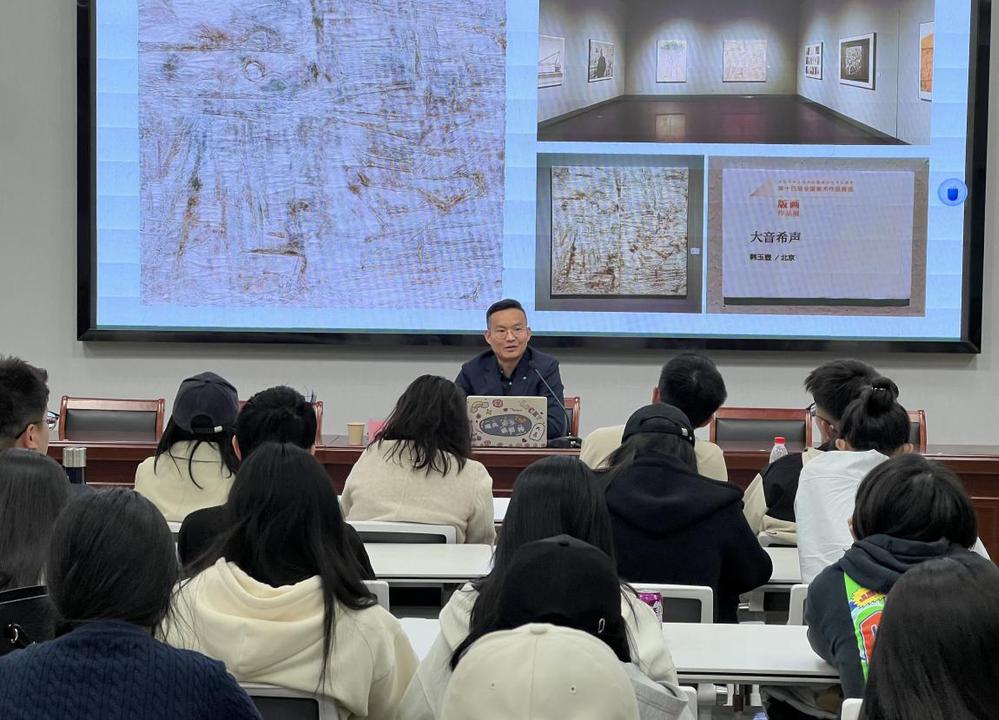 韩玉壶副教授在书画印创作、绘画与书法比较、书法教育理论与实践研究等领域深耕多年,成果斐然。此次讲座,他凭借深厚的学术功底与丰富的教学经验,围绕书法基础教学核心环节展开深入剖析,为师生们打开了全新的认知视野。