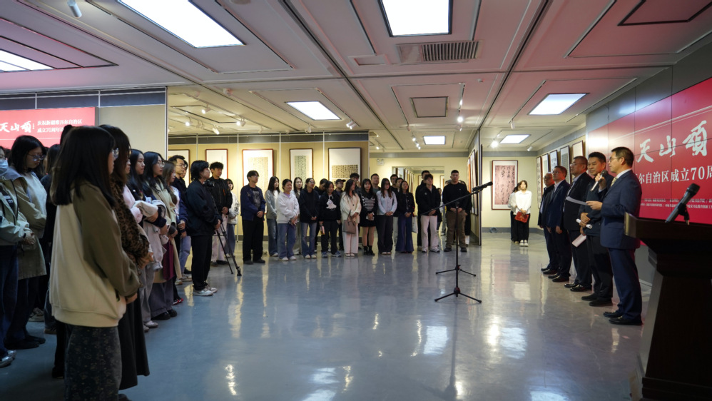 在热烈庆祝新疆维吾尔自治区成立70周年之际,“天山颂——庆祝新疆维吾尔自治区成立70周年诗词书法展”在新疆艺术学院美术馆启幕。新疆艺术学院党委常委、副院长全立新,新疆文联副主席、中国书法家协会理事、西泠印社社员、新疆书法家协会主席张鸿林,新疆艺术学院党委常委、纪委书记、监察专员陈建平,党委常委、宣传部长周达疆,书法学院师生以及书法爱好者共同出席了开幕式。